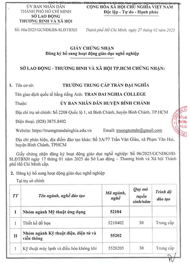 Ngày 27/02/2025 Sở Lao động - Thương binh và Xã hội Thành phố Hồ Chí Minh cấp giấy chứng nhận đăng ký bổ sung hoạt động giáo dục nghề nghiệp cho Trường Trung cấp Trần Đại Nghĩa: