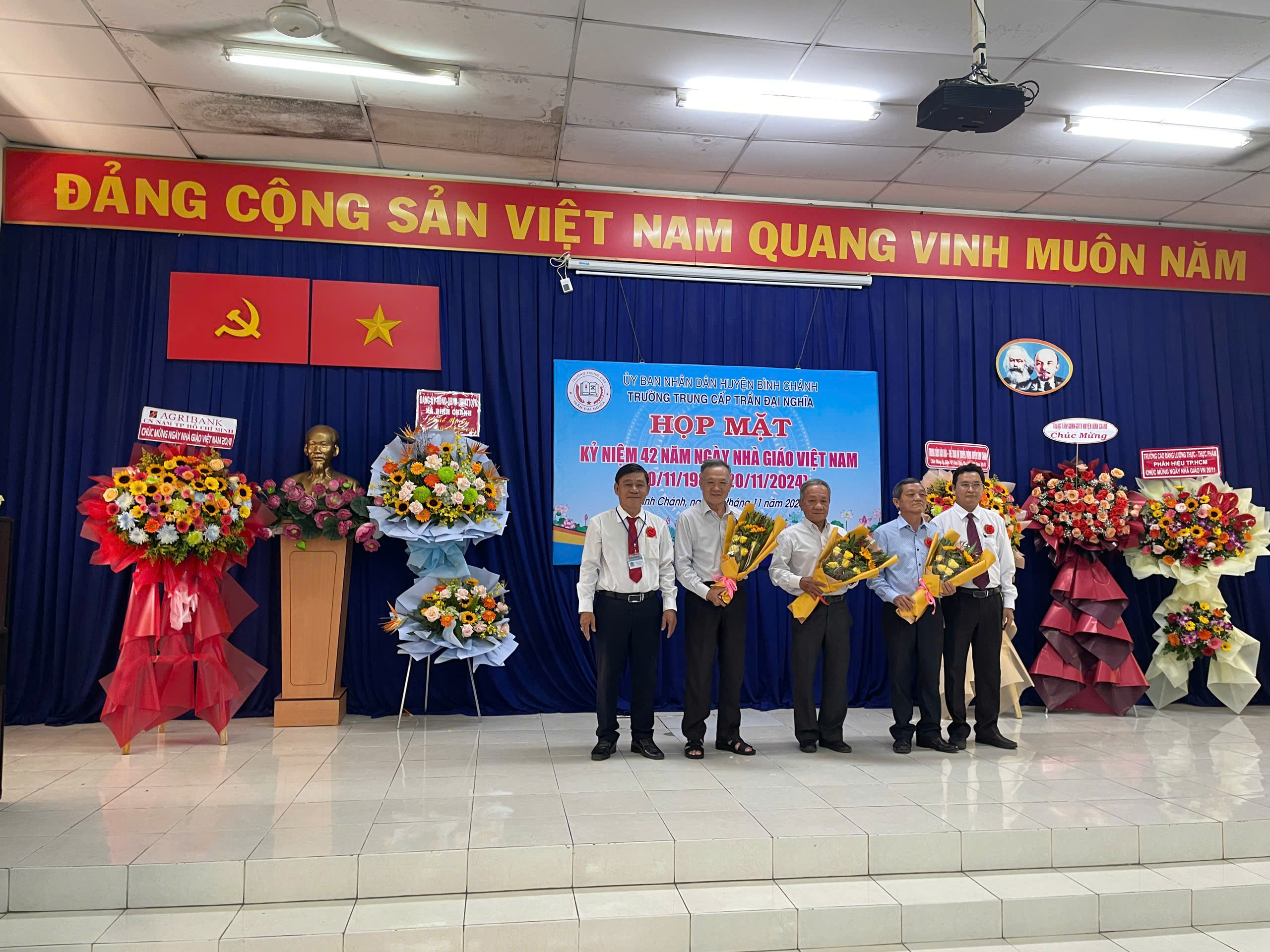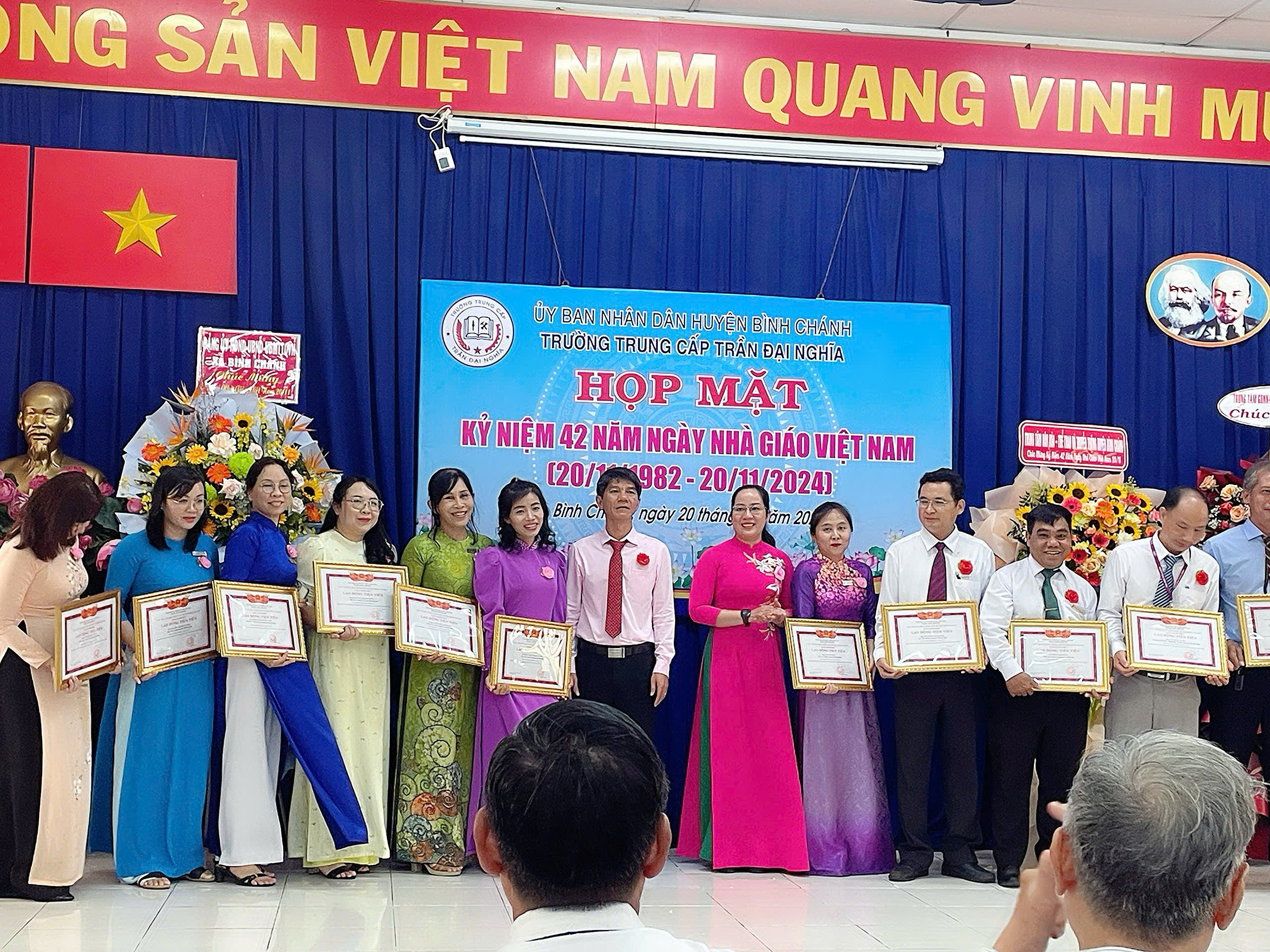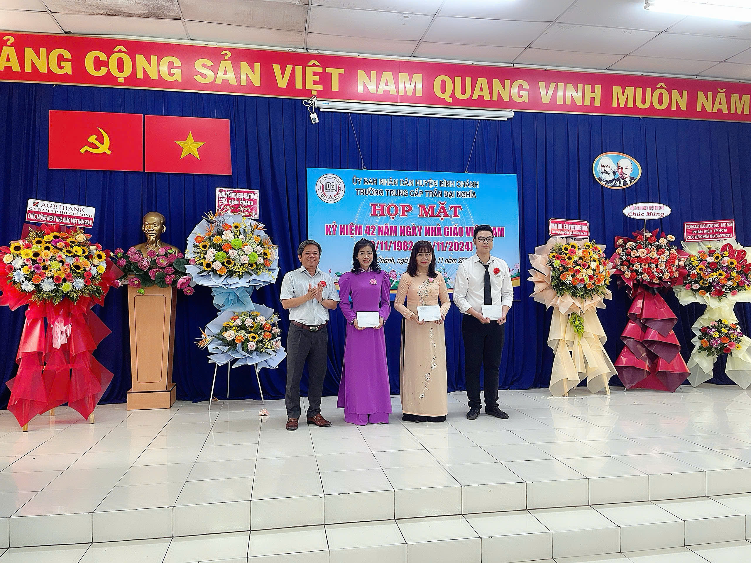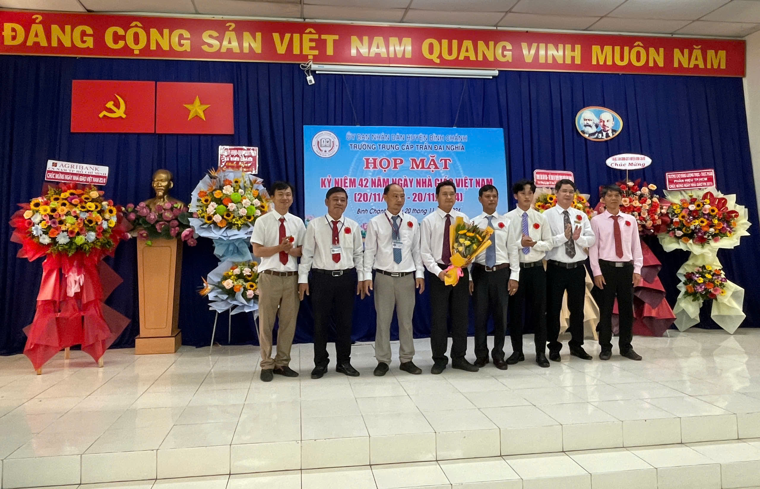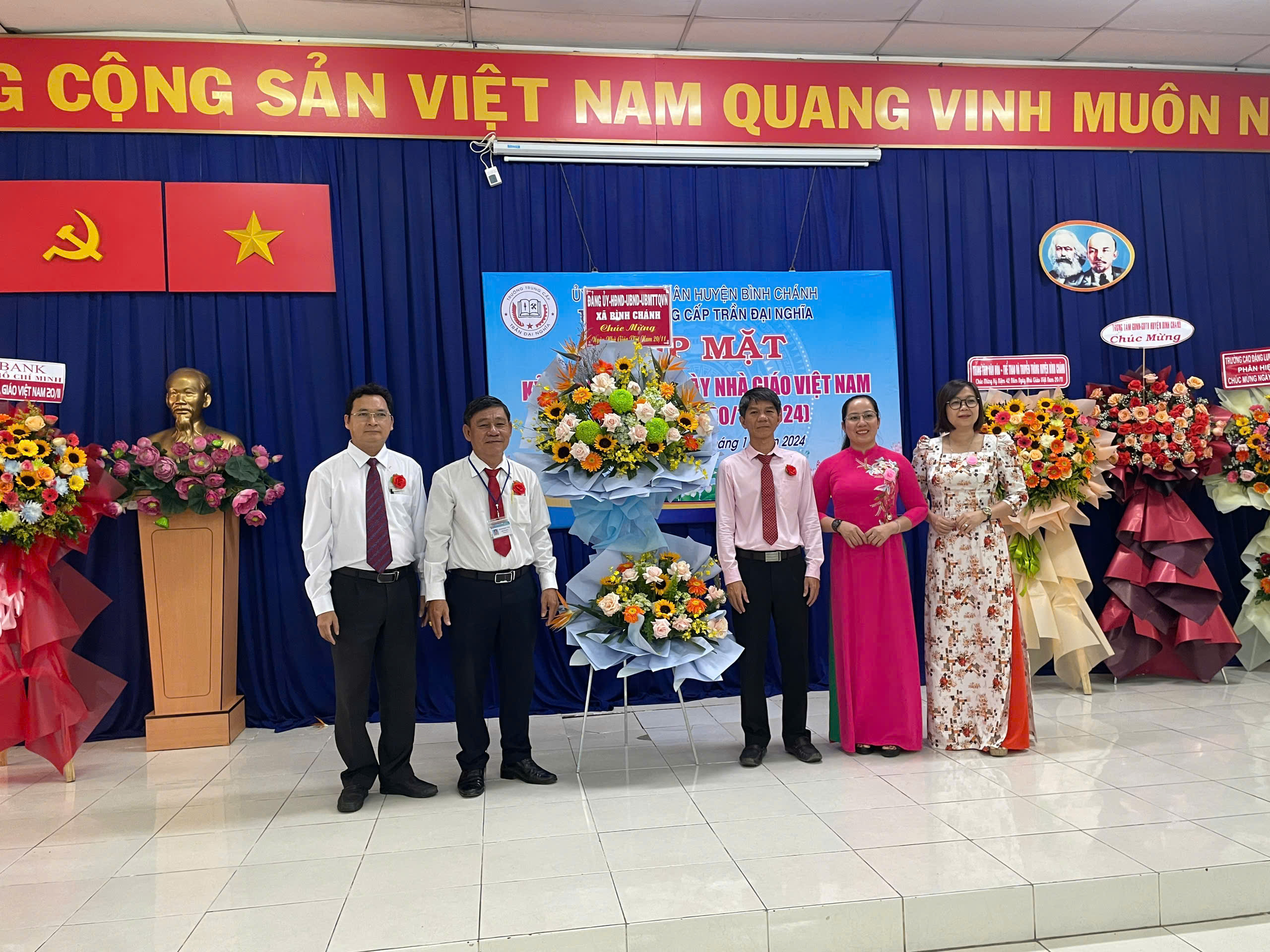 Sáng ngày 20/11/2024, Trường Trung cấp Trần Đại Nghĩa long trọng tổ chức Lễ kỷ niệm 42 năm ngày Nhà Giáo Việt Nam (20/11/1982- 20/11/2024) và Lễ khai giảng các lớp trung cấp Khóa 10, niên khóa 2024-2026. Đến dự có ông Nguyễn Quốc Tuấn - Phó Bí thư Thường trực Đảng ủy xă B́nh Chánh; ông Trần Hồ Cảnh Phúc - Giám đốc Trung tâm Văn hóa - Thể thao và Truyền thông Huyện; bà Trương Thị Hường - Đảng ủy viên - Phó Chủ tịch UBND xã Bình Chánh; ông Mai Ngươn Khánh - Phó Chủ tịch Hội Nông dân Huyện; ông Phạm Minh Hải - Giám đốc Công ty TNHH CPPM; ông Đỗ Mạnh Thắng - Phó Giám đốc Công ty Cổ phần Công nghệ Sơn Vũ; ông Hoàng Xuân Chính - Phó Hiệu trưởng Trường Cao đẳng Lương thực Thực phẩm phân hiệu tại TP.HCM; đồng chí thiếu tá Lê Nin Huy Phương - Cán bộ Ban Chỉ huy Quân sự Huyện; Quư thầy cô là CBQL qua các thời kỳ: Ban đại diện CMHS cùng CBQL, GV, NV và học sinh toàn trường. Dịp này, nhà trường ra mắt Hội đồng Trường gồm 7 thành viên, đặc biệt có sự tham gia của 02 Doanh nghiệp trên địa bàn huyện vào Hội đồng Trường; Trường cũng khen thưởng cho các cá nhân hoàn thành xuất sắc nhiệm vụ năm học 2023-2024; khen thưởng Phong trào Hội giảng và Hội thao chào mừng ngày Nhà Giáo Việt Nam năm học 2024-2025.