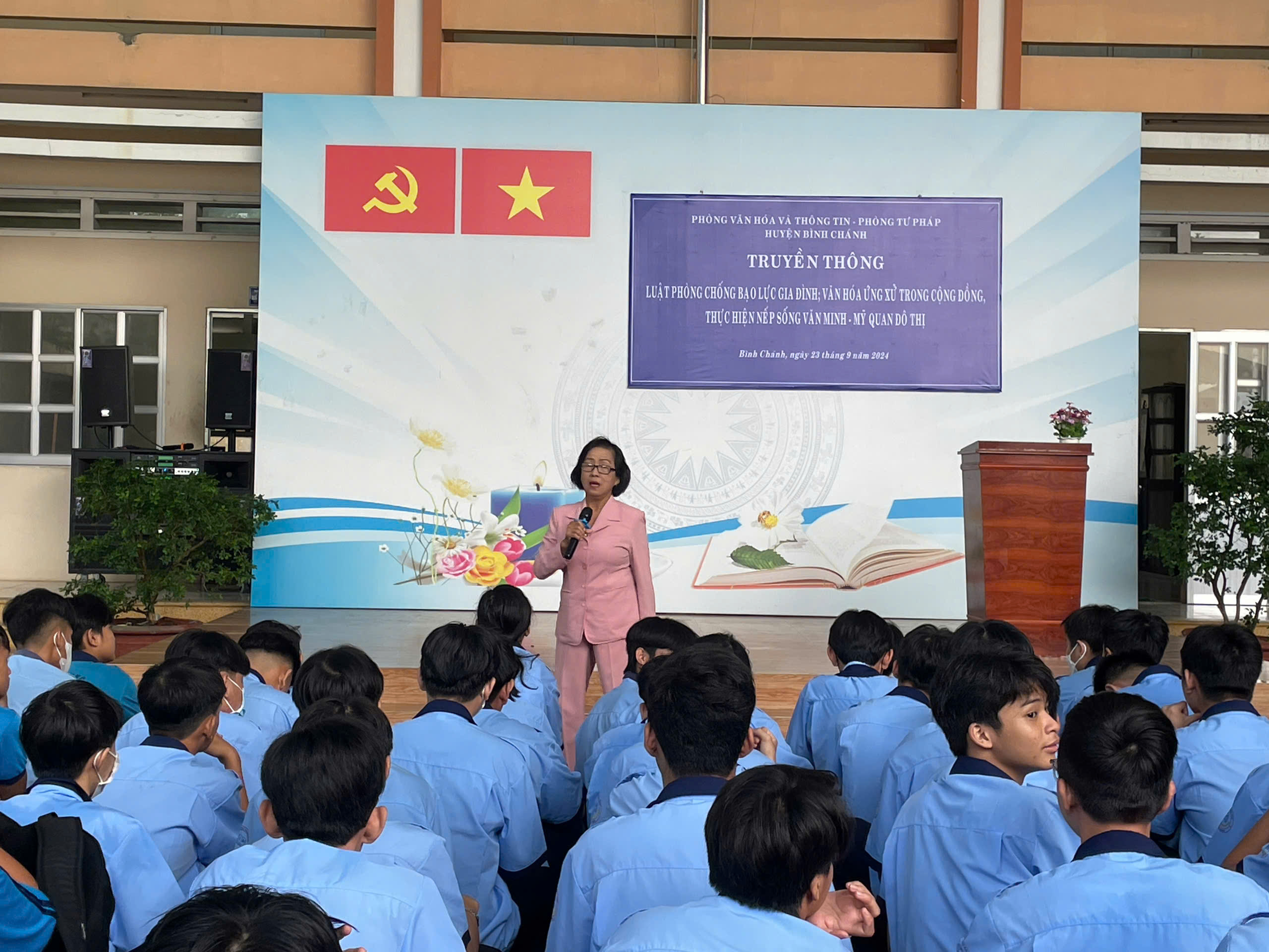 Sáng 23/9, tại Trường Trung cấp Trần Đại Nghĩa, Phòng Văn hóa và Thông tin huyện - Phòng Tư pháp huyện Bình Chánh phối hợp tổ chức Truyền thông Luật Phòng chống bạo lực gia đình, Văn hóa ứng xử trong cộng đồng, thực hiện nếp sống văn minh - mỹ quan đô thị.