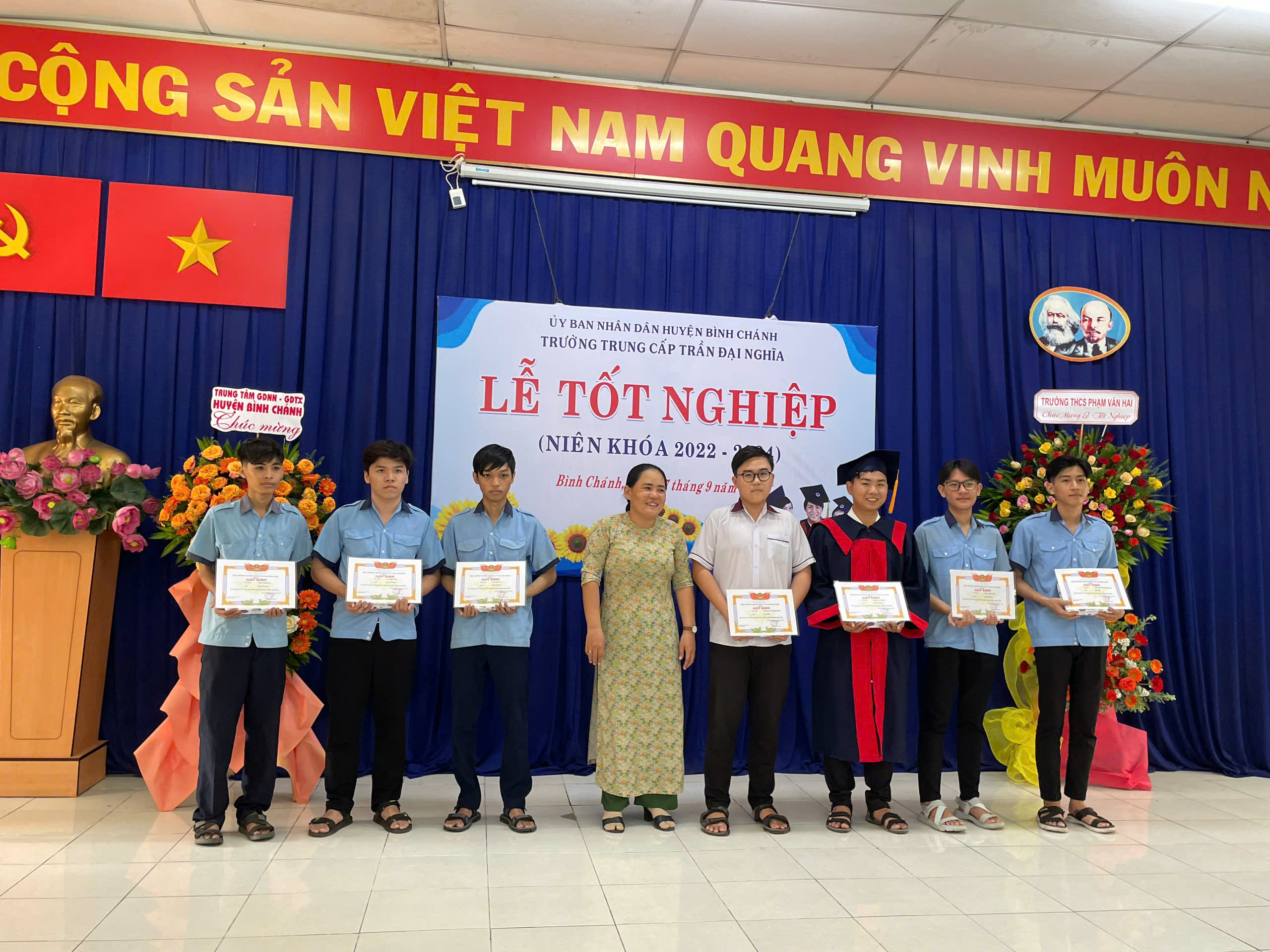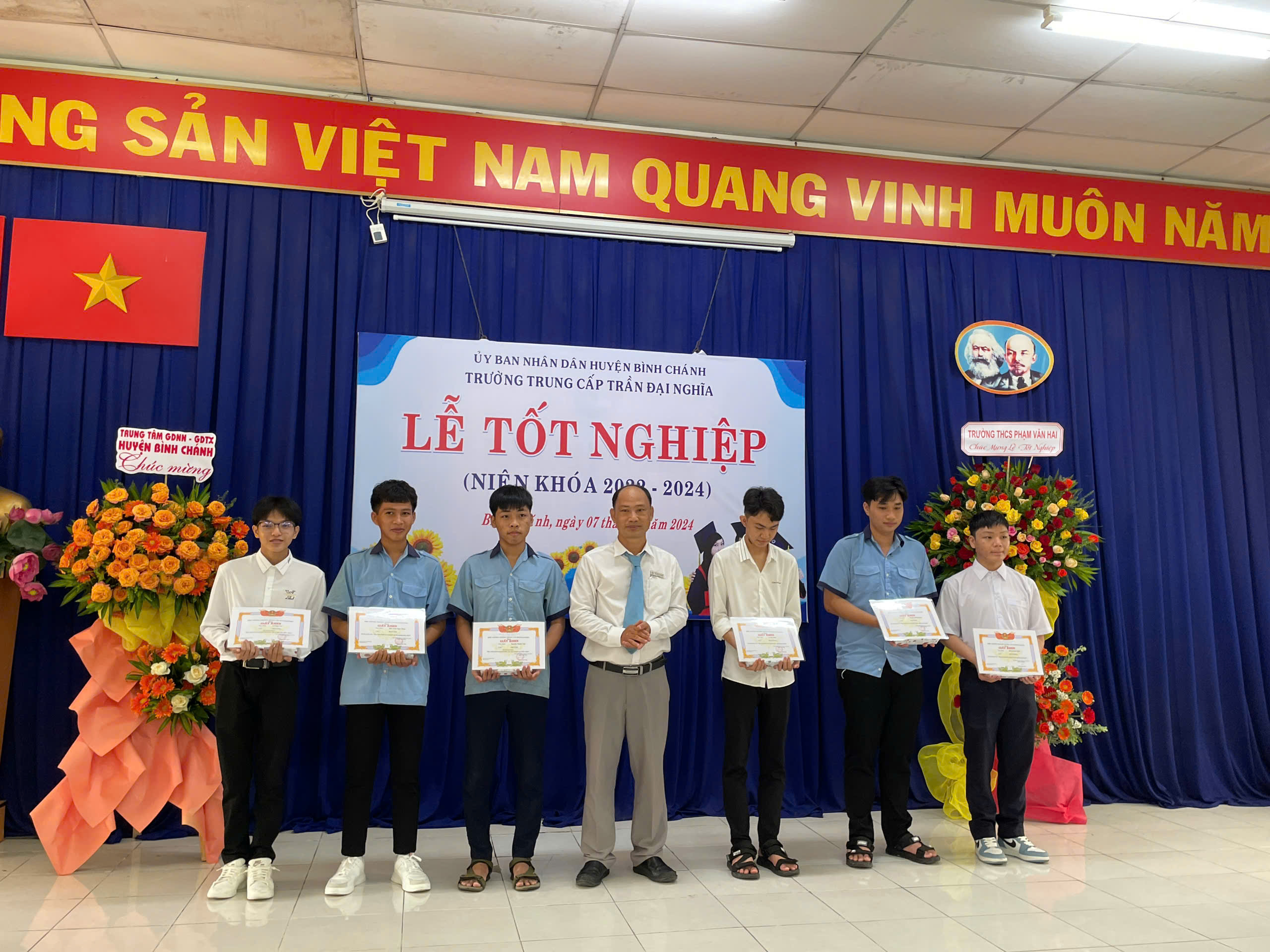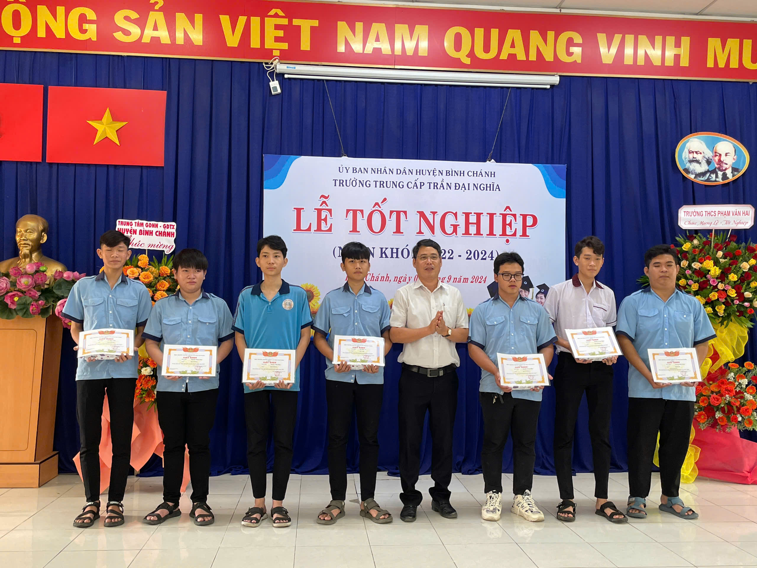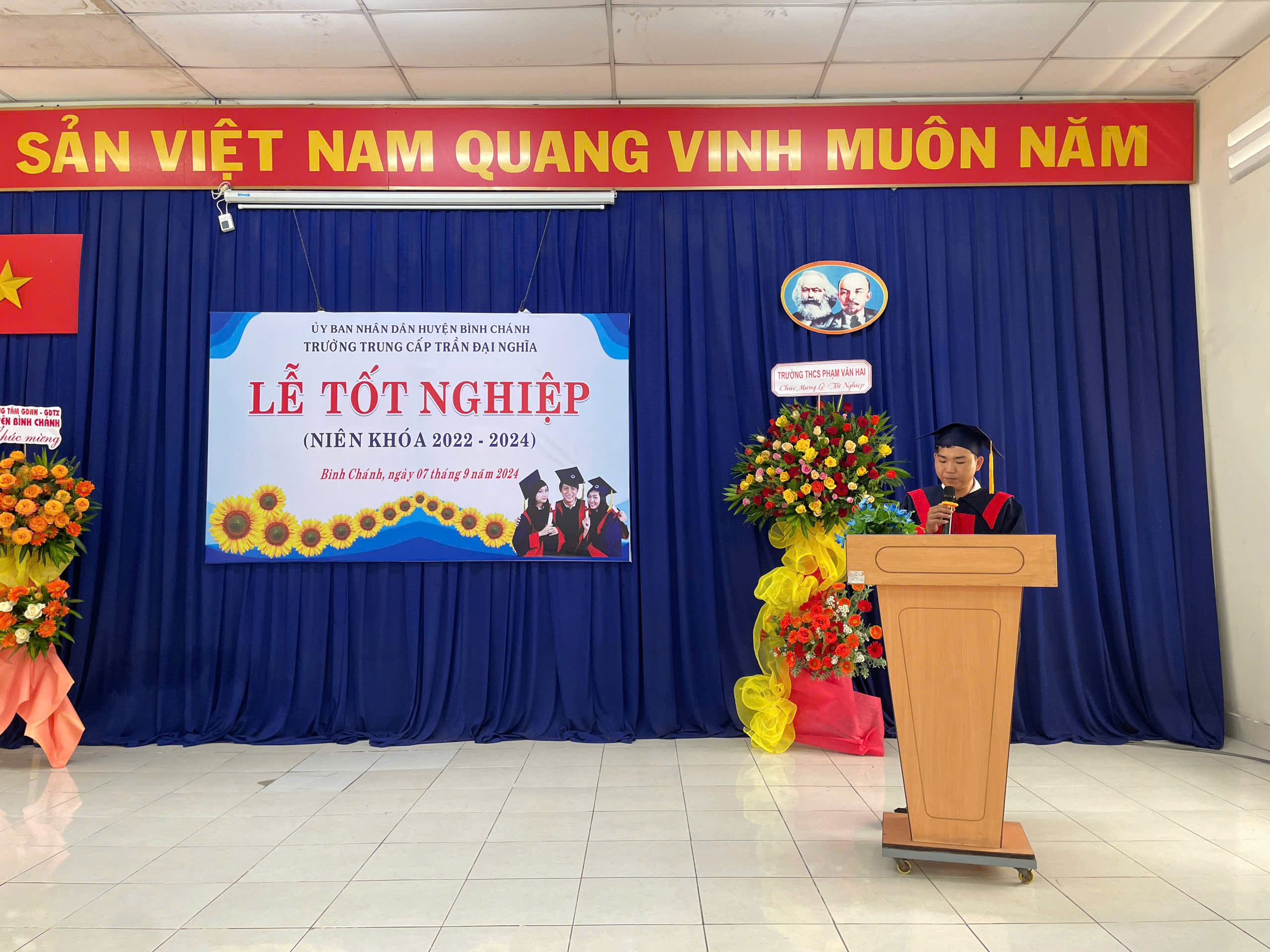 Sáng ngày 7/9/2024, Trường Trung cấp Trần Đại Nghĩa tổ chức Lễ tốt nghiệp bậc trung cấp cho 108 sinh viên khóa 08 niên khóa 2022-2024, đến dự có: Ông Nguyễn Quốc Thanh Long- Giám đốc Trung tâm GDNN-GDTX huyện Bình Chánh, Bà Phan Thị Bích Liễu- Phó Chủ tịch UBND xã Bình Lợi, ông Đỗ Mạnh Thắng- Phó Giám đốc Công ty cổ phần Công nghệ Sơn Vũ.