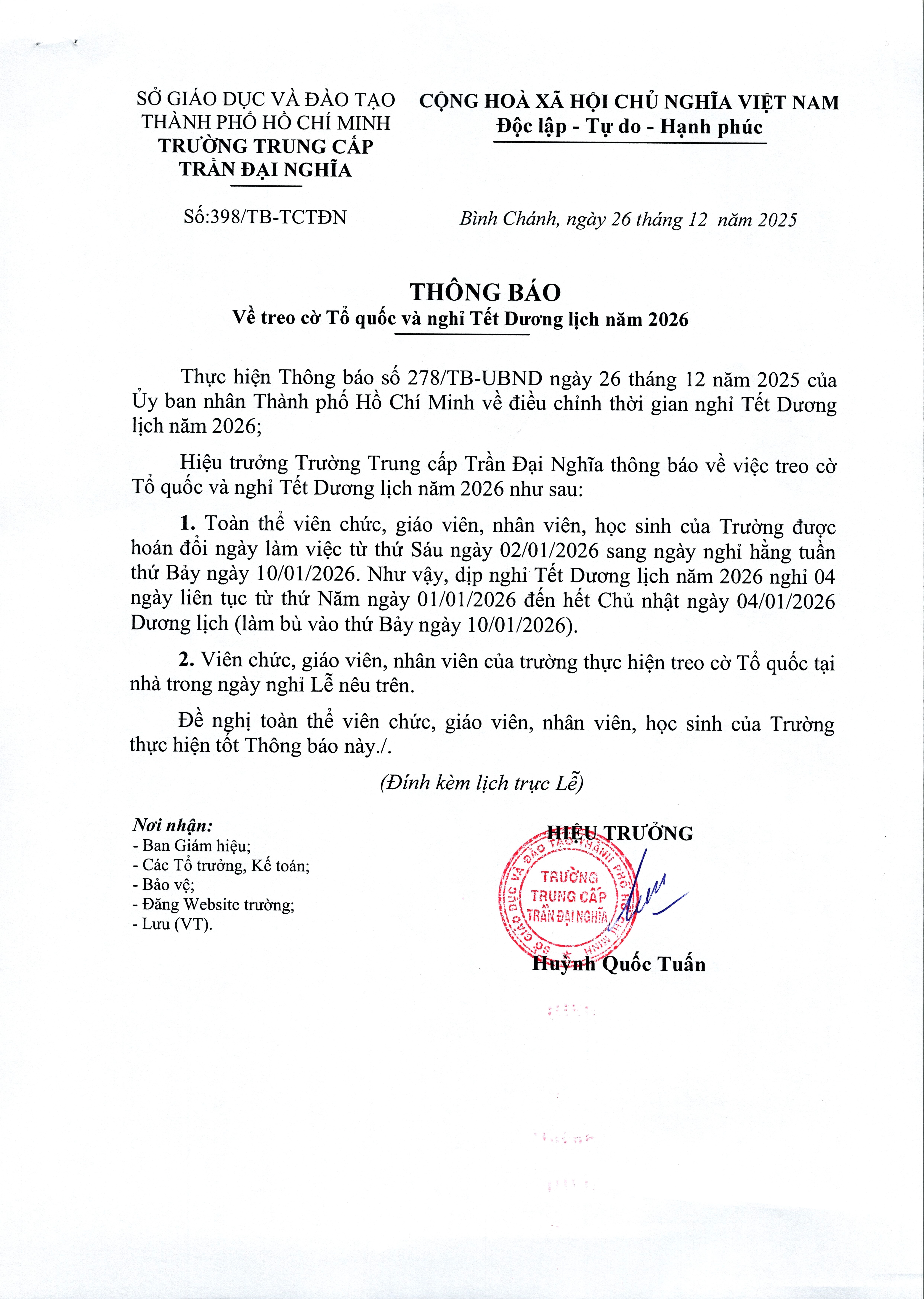 Thông báo về treo cờ Tổ quốc và nghỉ Tết Dương lịch năm 2026.