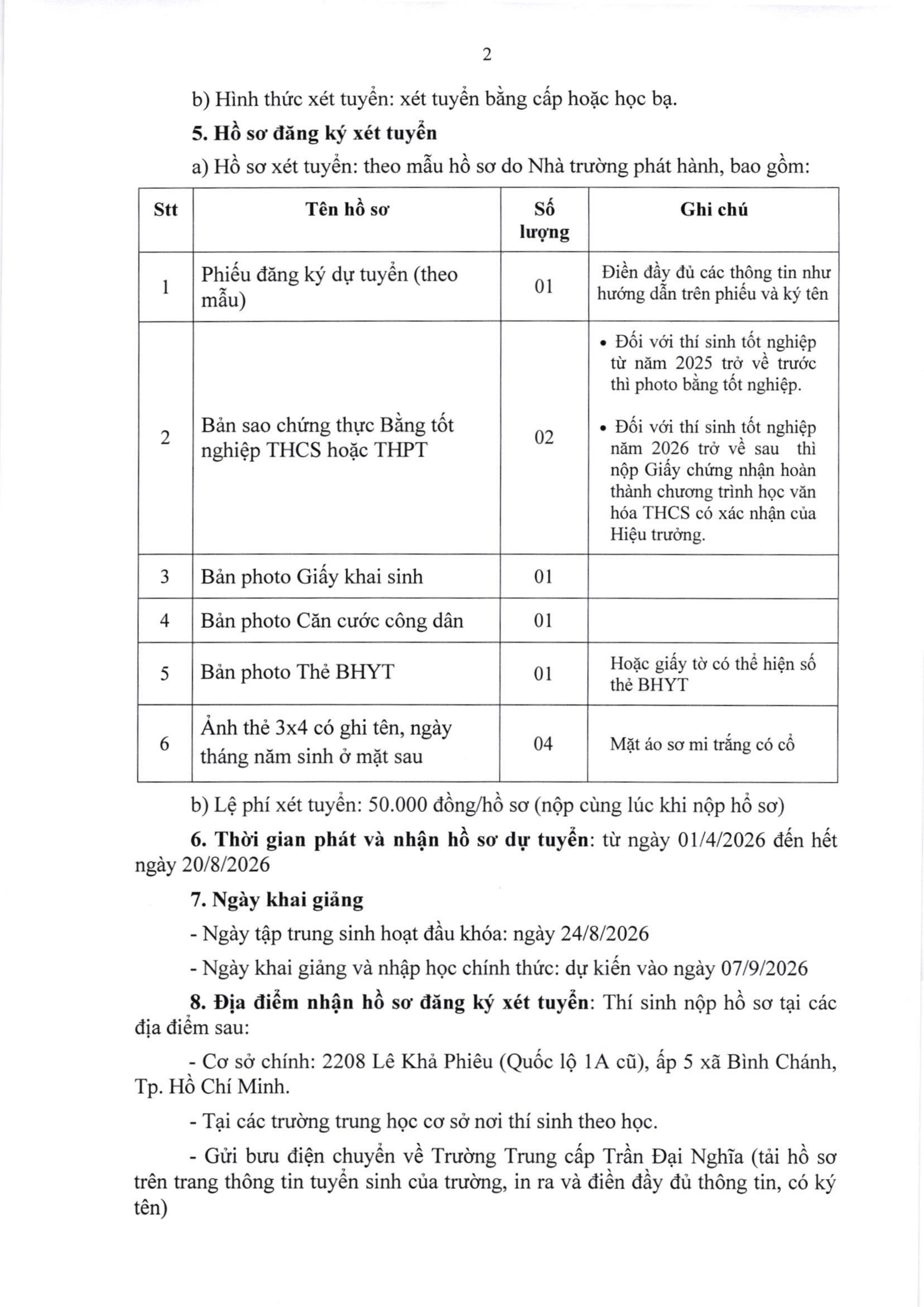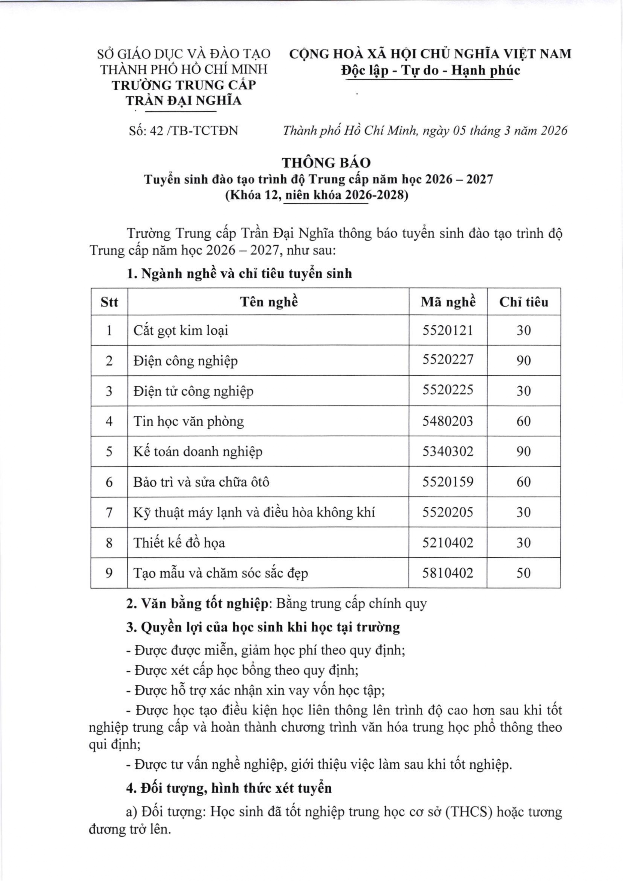 Thông báo tuyển sinh trình độ Trung cấp năm học 2026 - 2027.